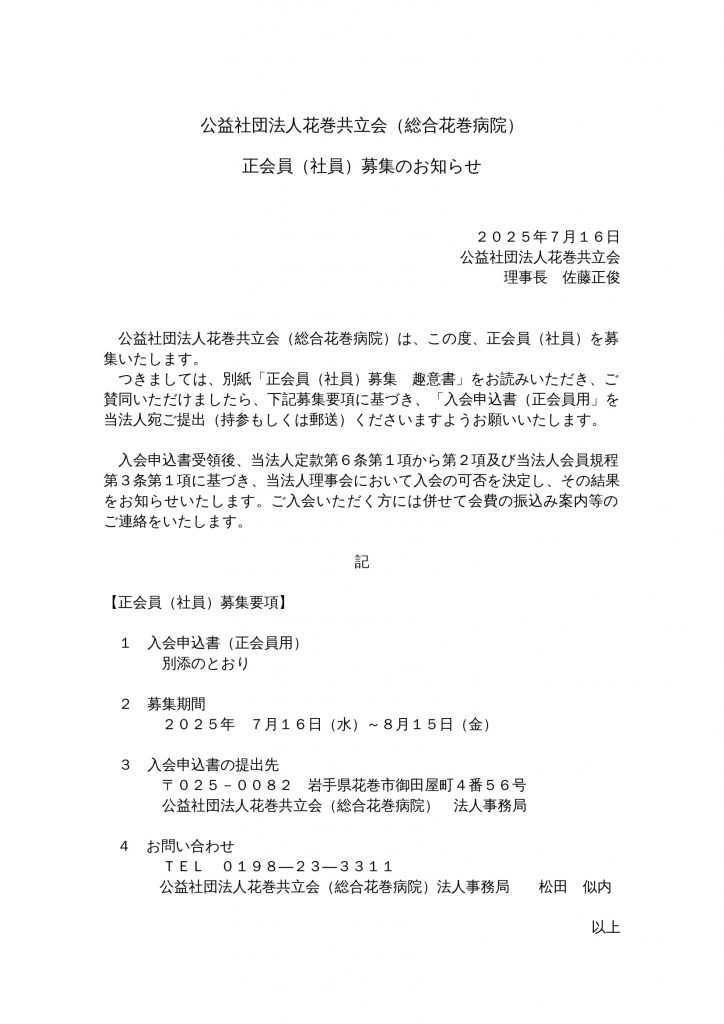 公益社団法人花巻共立会 正会員(社員)募集のお知らせ 2025.08.072026.03.04 各種書類のダウンロードは以下よりお願いいたします。 正会員(社員)募集趣意書 入会申込書(PDF) 入会申込書(Word)